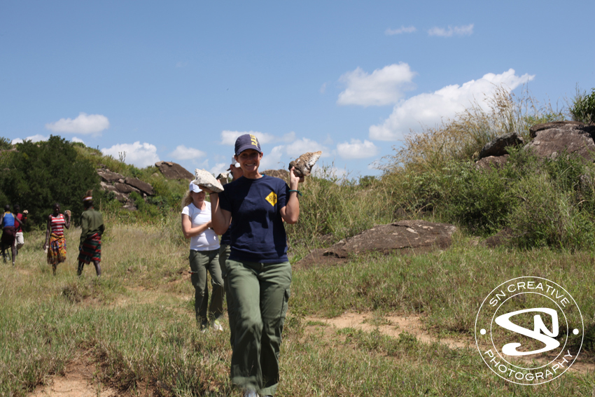 The next day we arrived at the scene of the sand dam where rocks where being chipped off a nearby rock outcropping and carried down to the river. We joined in. It’s so amazing to see this. In America, if you need stones and gravel, you go to Home Depot or call someone. Here they head to the hills and start chipping stones off the rocks with large mallets. Smaller stones are then further broken down with little hammers and women sit amongst a pile of rocks cracking each one smaller and smaller into gravel. We spent the morning walking the now worn path to the river carrying rocks. The villagers where amused at our obvious lack of skill and awkwardness trying to carry the rocks in our arms. Mercifully, the women intervened and provided us with straw donuts (for lack of a better description) to put on our head to help distribute the weight of the rocks and carry them on our heads. The women do this effortlessly, carrying quite heavy rocks balancing on their heads, arms free about their sides. This habit of carrying things on their heads has produced women who walk with pride and grace. The women are amazing and a story unto themselves.