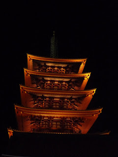 I make my way through Tokyo, change trains and arrive in good time at the Narita airport to pick up Tara, little sis and co-adventurer for the next two weeks. Her flight is delayed, but without too much ado we make our way back to the hotel. She was up for a stroll and dinner out. While on our search for dinner we unexpectedly find Senso-ji Temple. I didn’t realize our hotel was that close to it. It was on the list of things to see and so we put our hunger aside and explored for a while. It was quite beautiful at night. Strings of bright lanterns line the way – something you’d miss entirely during the day. The pagoda is brightly lit, and it’s red an gold make an even more impressive display against the black sky.